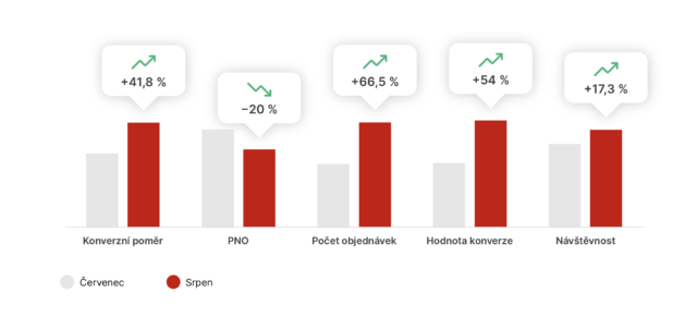 Upravený XML feed a strategické řízení kampaní přinesly klientovi viditelné zlepšení. Vyšší konverzní poměr, více objednávek, vyšší obrat, nižší PNO a efektivnější využití rozpočtu. Výsledky přitom přišly ještě před hlavní sezónou. Podzim a Vánoce, které jsou pro tento sortiment klíčové, teprve začínaly. Optimalizace tak vytvořily pevný základ pro období s nejvyšší poptávkou a další očekávaný růst.