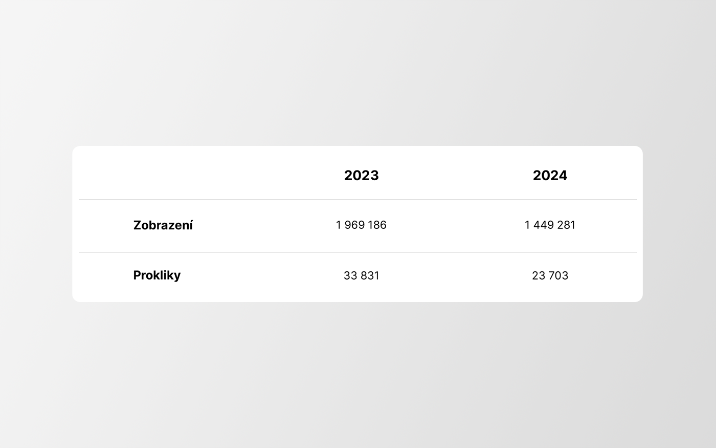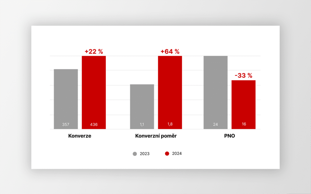 Přijatá opatření na jednu stranu snížila počet zobrazení a prokliků v důsledku vymazání nevýkonných položek. Na druhou stranu však ve feedu zůstaly jen relevantní produkty, a tím se zlepšila i výkonnost kampaně. Pokles PNO o 33 %, nárůst konverzí o 22 % a propad ceny za konverzi na téměř polovinu. Na grafu níže najdete detailní data, která srovnávají stav v roce 2023 a 2024. Červené na bílém.
