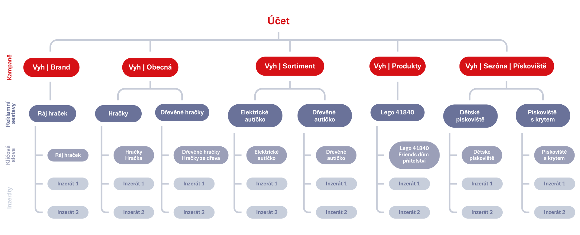 Vhodná struktura vyhledávacích kampaní může vypadat například takto: