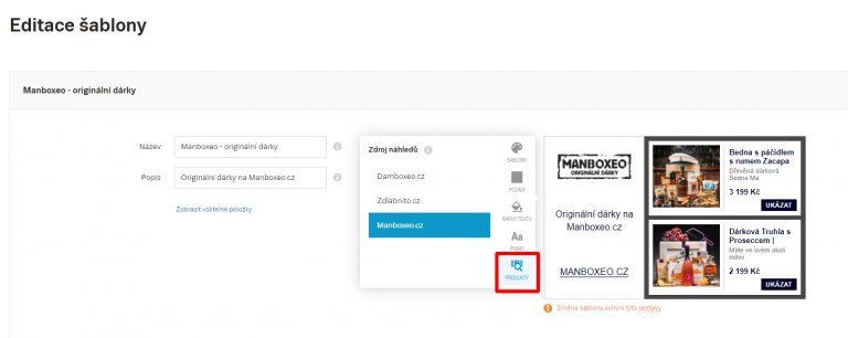 V Šabloně upravujete design a vybraný text banneru, který se bude uživatelům zobrazovat – volíte barvy jednotlivých prvků, font písma a můžete vložit Popis, který se bude na šabloně zobrazovat.