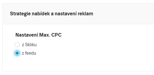 V Nastavení kampaně Nákupy v Skliku zvolte v Strategii nabídek a nastavění reklam možnost nastavení Max. CPC z feedu.